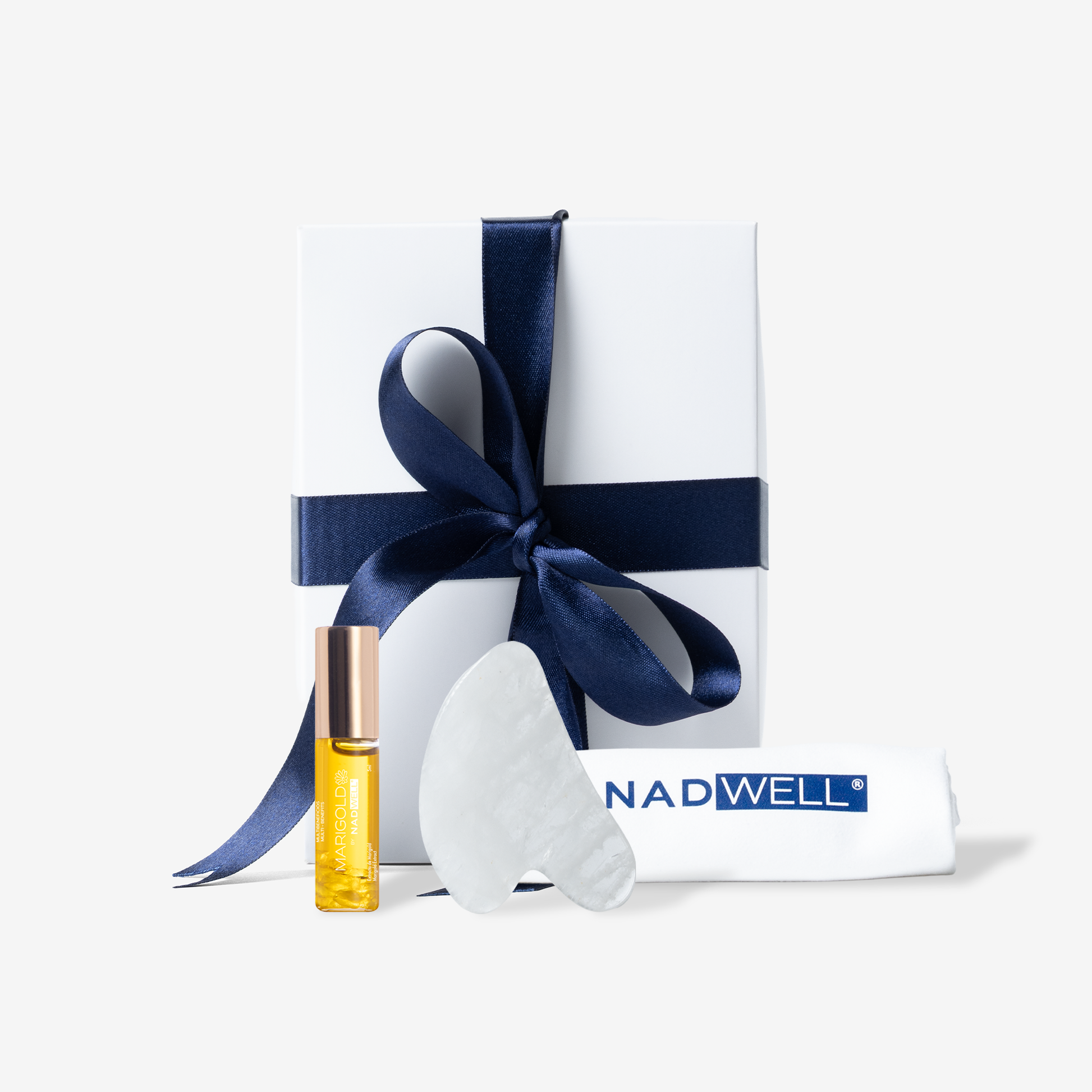 El Kit Regalo Nadwell reúne tres herramientas esenciales para transformar la piel: nuestro Extracto Marigold, una gua sha de cuarzo natural y una toalla de microfibra ultrasuave. Todo presentado en una hermosa caja con cinta azul, ideal para sorprender a quien más quieres… o para darte un regalo a ti misma.